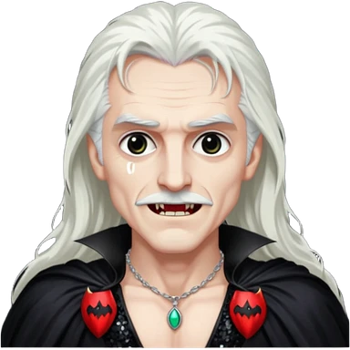 Dracula with long white hair, dark red sequin baggy pants, shirtless with necklace emoji