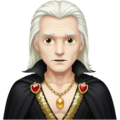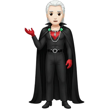 Dracula with long white hair, black sequin baggy pants, shirtless with necklace, black sequin cape emoji