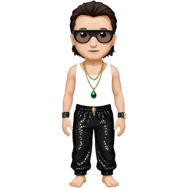 Bono with dark brown hair, black sequin baggy pants, shirtless with necklace, light skin emoji