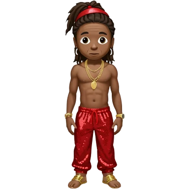Lil Wayne with long dark brown hair, red sequin baggy pants, shirtless with necklace emoji