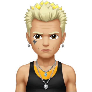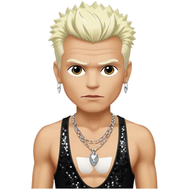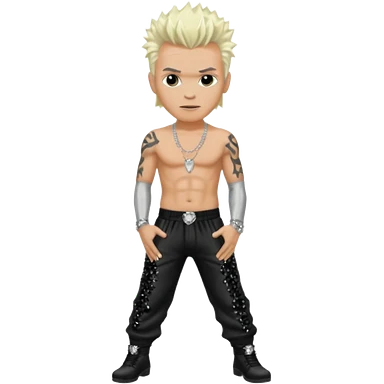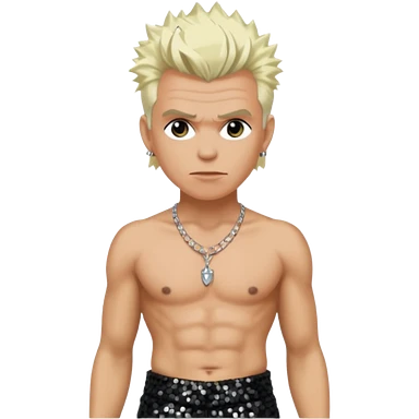Billy Idol with platinum blonde hair, black sequin baggy pants, shirtless with necklace emoji
