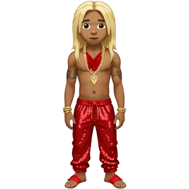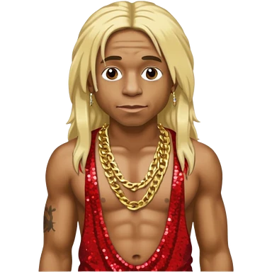 Lil Wayne with long blonde hair, red sequin baggy pants, shirtless with necklace emoji