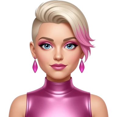 P!nk with blue eyes, blonde faux hawk hair with pink highlights, pink eyeshadow and lipstick, pink metallic high neck dress, pink earrings emoji