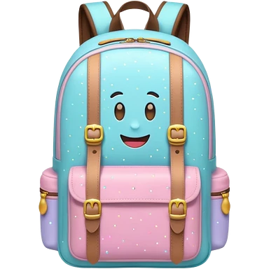 A cheerful emoji-style travel backpack with small sparkles around it, symbolizing excitement for a new journey. Simple flat style, pastel tones, white background.emoji