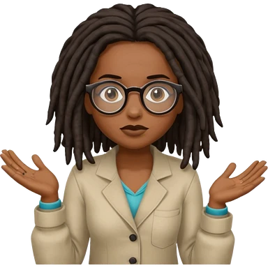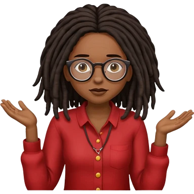 darker skin female with dark dreadlock hair wearing large round glasses shrugging her shoulders emoji