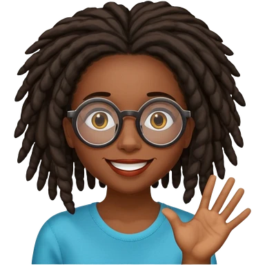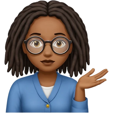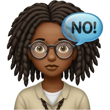 darker skin female with dark dreadlock hair wearing large round glasses with a word bubble that says no emoji