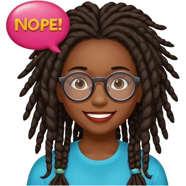 darker skin female with dark dreadlock hair wearing large round glasses with a word bubble saying "nope" emoji