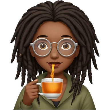 darker skin female with dark dreadlock hair wearing large round glasses sipping a cup of tea with her pinky out emoji