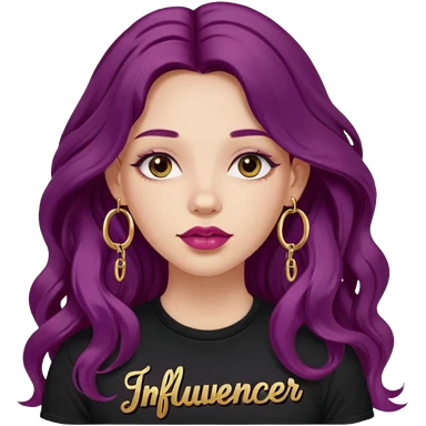 Girl with burgundy purple wavy long hair wearing a black tshirt "influencer " in pink lettering font, large gold hoop earrings & lip piercing emoji