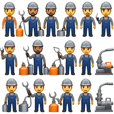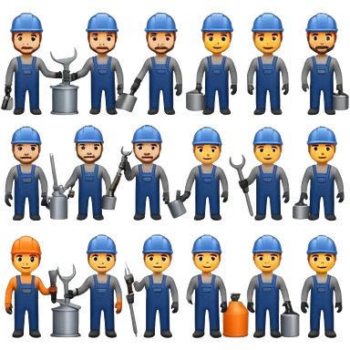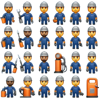 Professional custom emojis of industrial workers: welder, grinder, CNC operator, spray painter, metalworker. Modern, clean, slightly 3D style. Industrial color palette: steel gray, navy, orange. Transparent background emoji