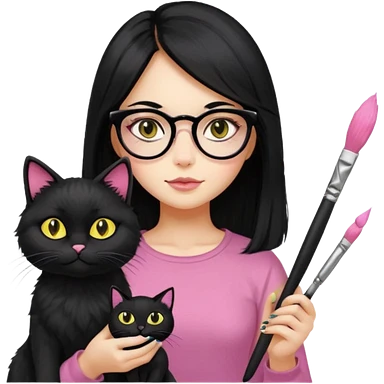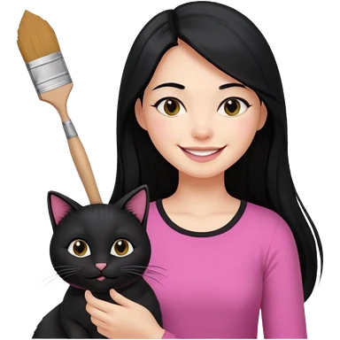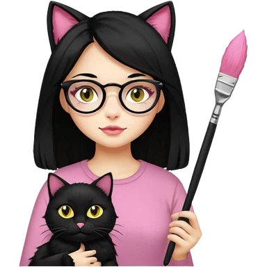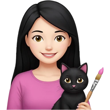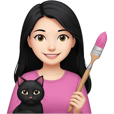 Painting women. smilling Long black hair, lunette peinture top pink, pinceau with is black cat emoji