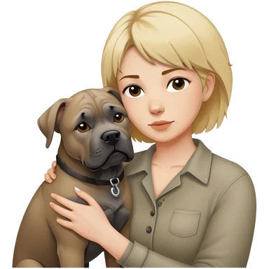Woman with short messy blonde hair sharing a hug with her fawn colored Cane Corso dog who has short pointed ears emoji