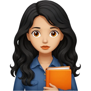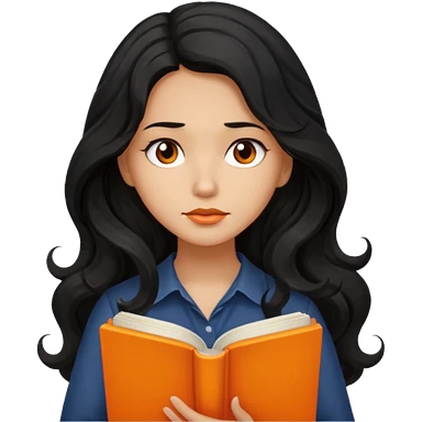 Long Hair Women with orrange Book, Black wavy hair, sad emoji