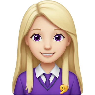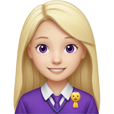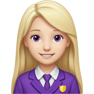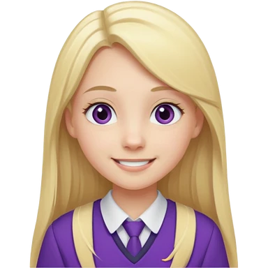 A pale girl with light blue eyes and long and blonde straight hair , smiling wearing a purple school uniform emoji