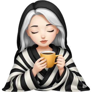 Pale girl with black and white hair inside a blanket sipping coffee eyes closed emoji