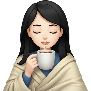 Pale girl with black hair inside a blanket sipping coffee eyes closed emoji