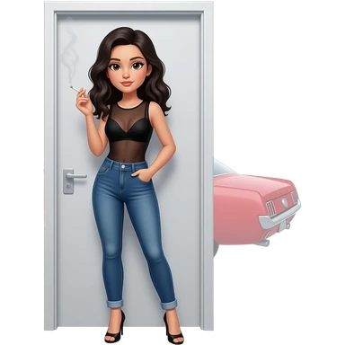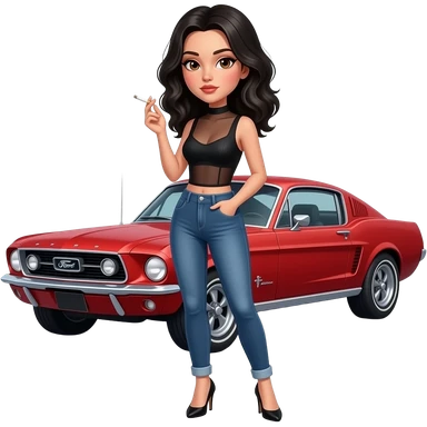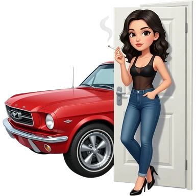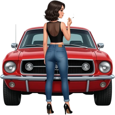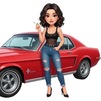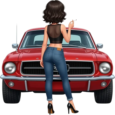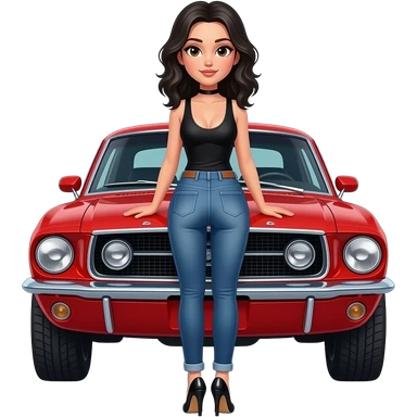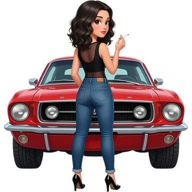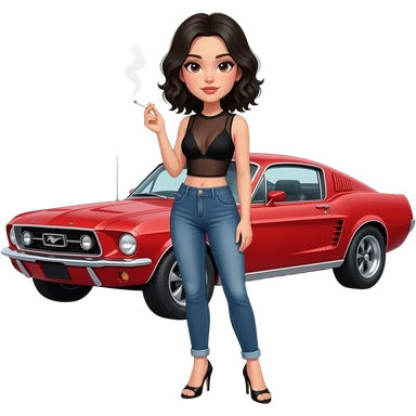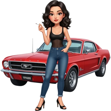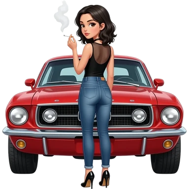 Pale girl with black wavy hair and brown eyes backed against the door of a red ford mustang 1968 coupe. Girl wearing a sheer black sleeveless top, low rounded neckline, jeans and heels with visible toes. smoking cigarette. Legs spread and hands resting on the hood. emoji | AI Emoji Generator