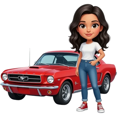 Pale girl with black wavy hair in front of a red Ford Mustang 1968 coupe. Girl wearing a sheer black sleeveless top with a medium neckline, jeans and heels with visible toes. Legs spread and hands resting on the hood. emoji | AI Emoji Generator