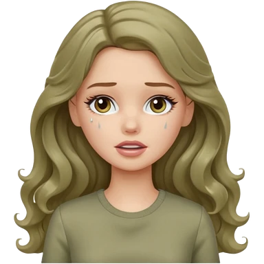 A white Barbie girl with long dark brown wavy hair in pale olive clothes crying with tears emoji