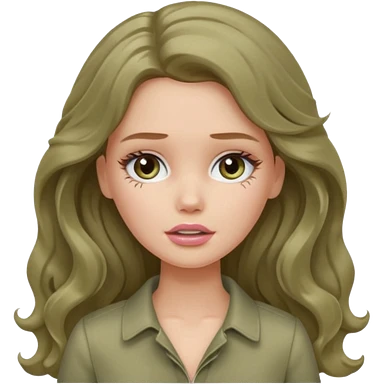 A white Barbie girl with long dark brown wave hair in a pale olive clothes doing stretching emoji