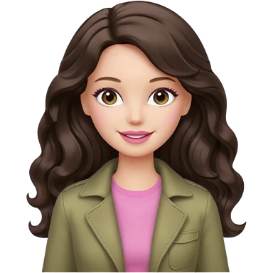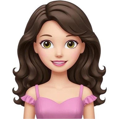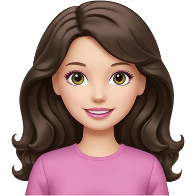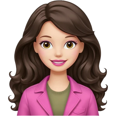 A white Barbie girl with long dark brown wavy hair in pale olive clothes pink and smail emoji