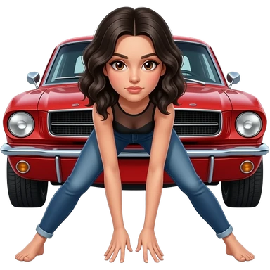 Pale girl with wavy jet black hair, seen from the side, bent forward and fixing the engine inside the open hood of a red ford mustang 1968 coupe. Girl wearing a sheer black sleeveless top and jeans. Legs wide spread emoji | AI Emoji Generator