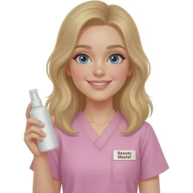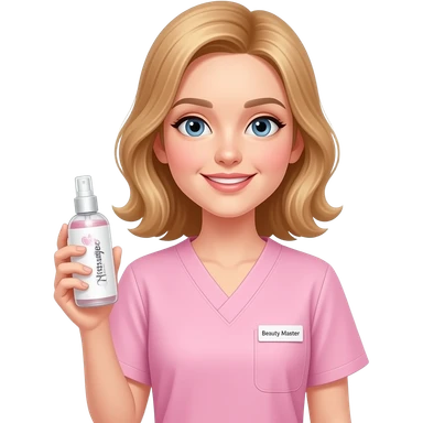 pretty fair-haired girl in pale pink scrubs, slight smile, holding middle white spray bottle, name tag "Бьюти Мастер". Pastel colors, clean vector, white background --ar 1:1 emoji