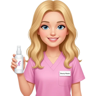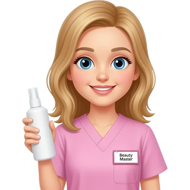 IOS emoji:pretty fair-haired girl in pale pink scrubs, slight smile, holding middle white spray bottle, name tag "Бьюти Мастер". Pastel colors, clean vector, white background --ar 1:1 emoji