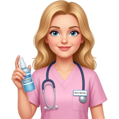 pretty fair-haired girl in pale pink medical scrubs, slight smile, holding "Чистодез" spray bottle, name tag "Бьюти Мастер". Pastel colors, clean vector, white background --ar 1:1 emoji