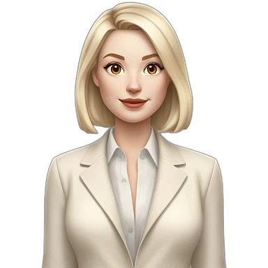 pale skin woman with ash blonde Straightened bob Hair, White Spacious classical jacket, beige palazzo Arrow pants and gray blouse holding white IPhone 15 pro in the hands emoji | AI Emoji Generator