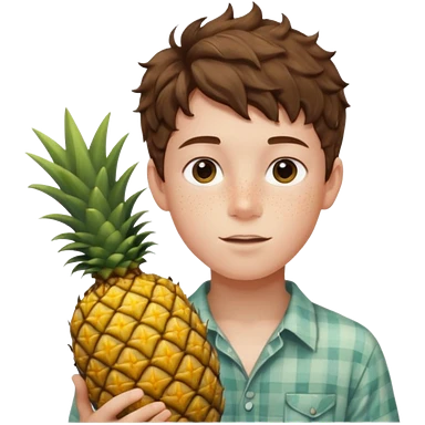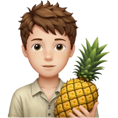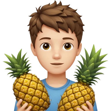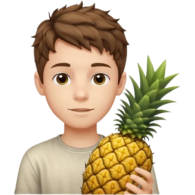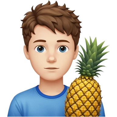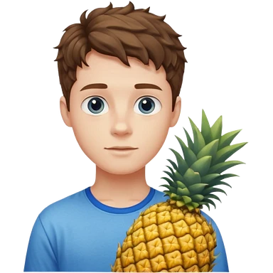 Pale teenage man with short wavy brown hair holding pineapple, prominent jawline, blue eyes emoji | AI Emoji Generator