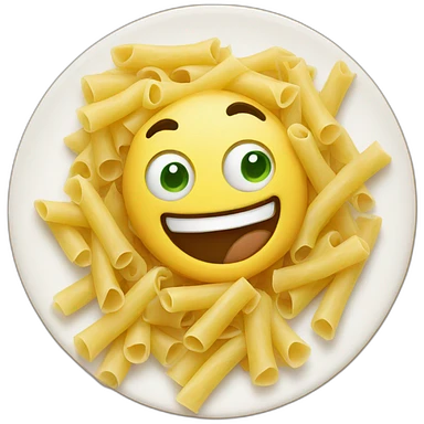 A cheerful cartoon dog happily eating a plate of spaghetti, with a few noodles hanging from its mouth, big sparkly eyes, and a wagging tail. The background is simple and minimalistic, focusing on the dog and the pasta. emoji