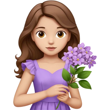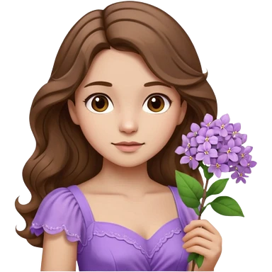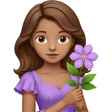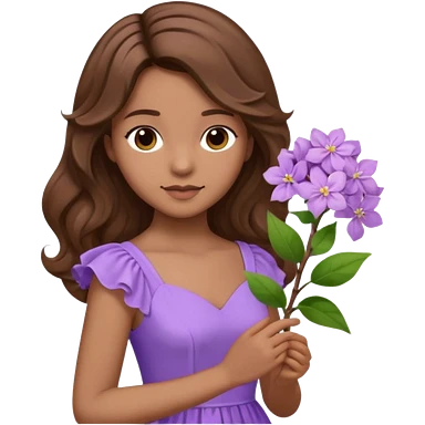 Menina parda/branca de cabelo ondulado castanho partido de lado com uma flor lilás e vestido lilás emoji