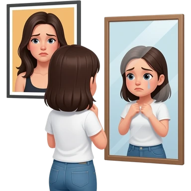 una chica triste viendose en un espejo ,su propio reflejo se cubre el cuerpo y hay en poster que muestra a una chica con un buen cuerpo emoji