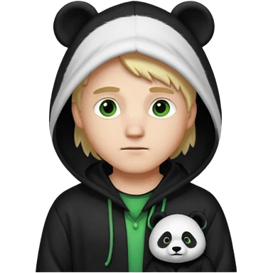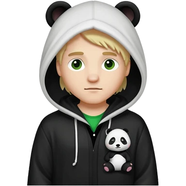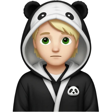 A white man with green eyes, medium-length blond hair, wearing a panda hoodie and black pajama-like robes. emoji