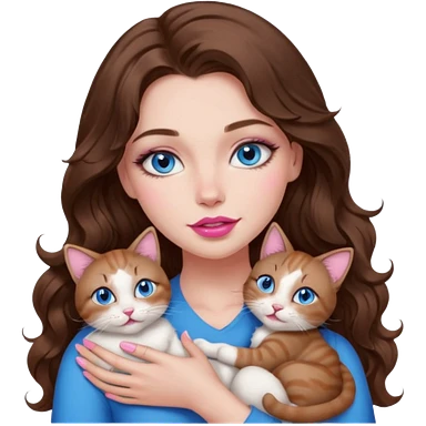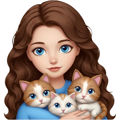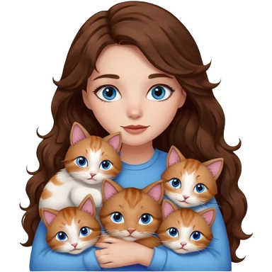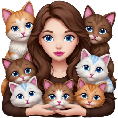 girl with long wavy brown hair, blue eyes, long lashes makeup, cuddling with 6 cute cats emoji