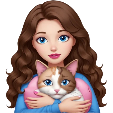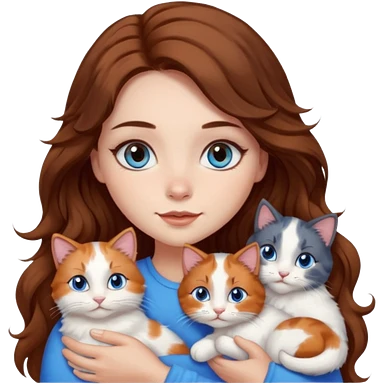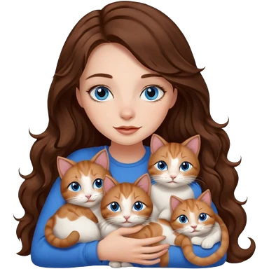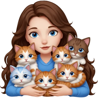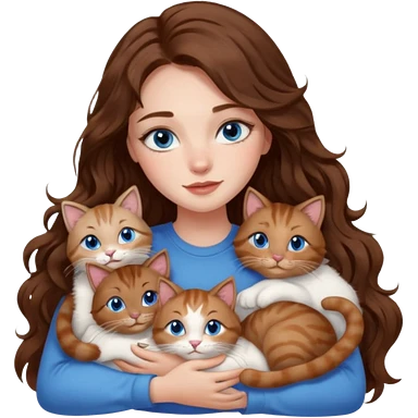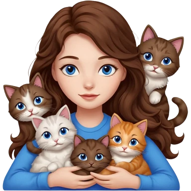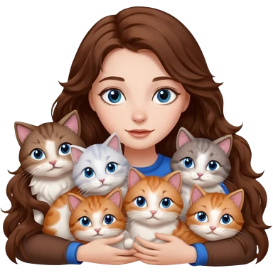 girl with long wavy brown hair, blue eyes, long lashes makeup, cuddling with 6 cats emoji