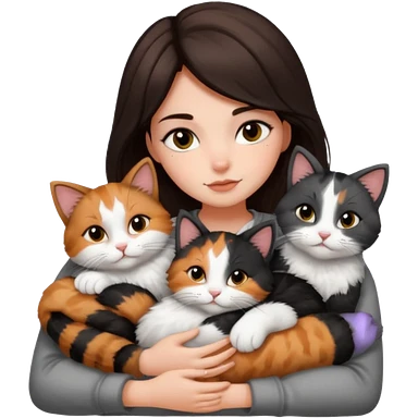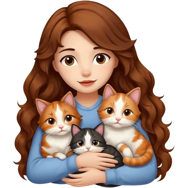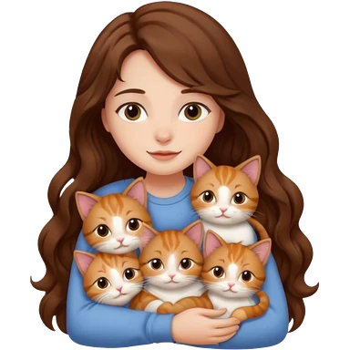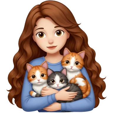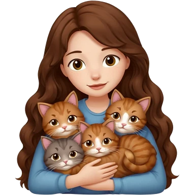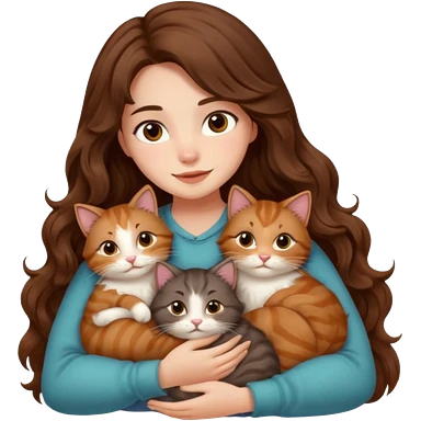 girl with long wavy brown hair cuddling with 6 cute cats emoji