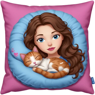 girl with long wavy brown hair, blue eyes, long lashes makeup, sexy pink lips, sleeping on a cozy pillow with 6 cats emoji