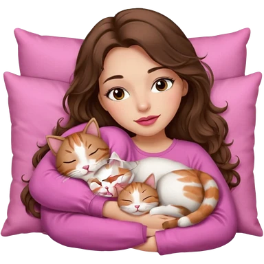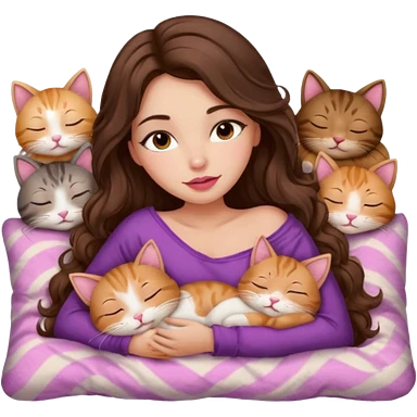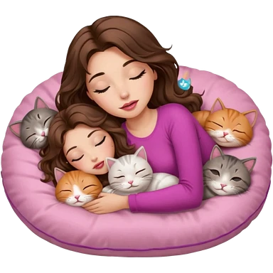 girl with long wavy brown hair, brown eyes, long lashes makeup, sexy pink lips, light to medium complexion, sleeping on a cozy pillow with 6 cats emoji