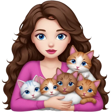 girl with long wavy brown hair, blue eyes, long lashes makeup, sexy pink lips, cuddling with 6 cats emoji