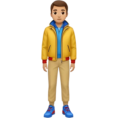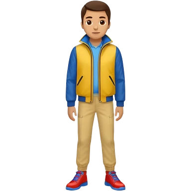 un hombre con: una chaqueta amarilla, pantalones rojos y zapatos azules. emoji