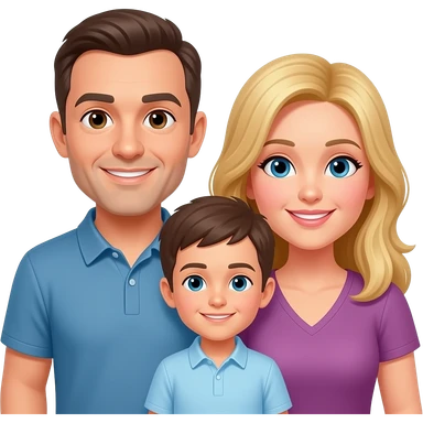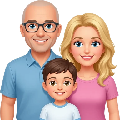 Papà calvo, mamma capelli neri occhi marroni, figlia capelli marroni mossi e occhiali tartarugati con montatura spessa occhi marroni, figlia capelli lisci marroni occhiali neri con montatura grande e fina occhi marroni emoji