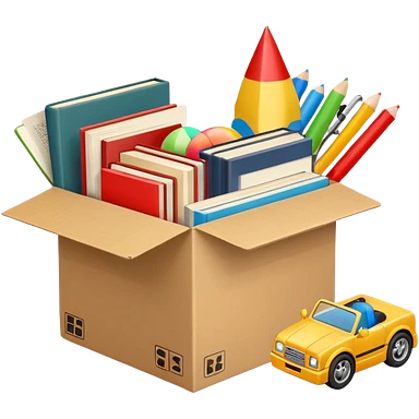 cardboard box with toys, rc, books, CD, realistic emoji
