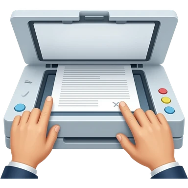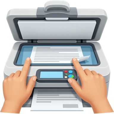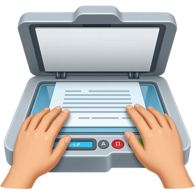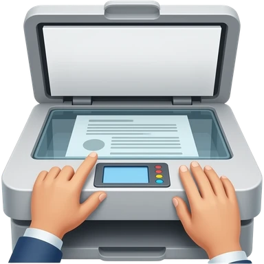 A clear close-up of hands scanning a document on a photocopy machine. One hand pressing the start button, the other adjusting the paper on the glass. Focus on the action of scanning, emoji