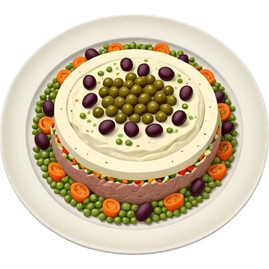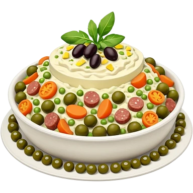 Salată de boeuf: a Romanian festive salad made with finely chopped boiled vegetables, pickles, peas, and beef or chicken, all mixed with mayonnaise and decorated with olives and pickles. emoji