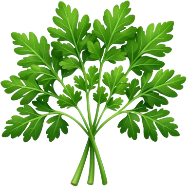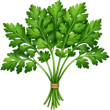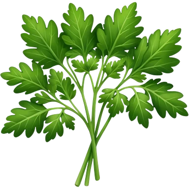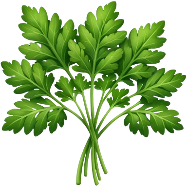 single parsley leaf, fresh, bright green, serrated edges, natural curves, glossy, fine central vein, branching lobes, no stem bunch, no background, soft lighting, emoji scale emoji