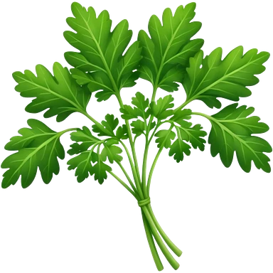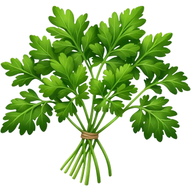 parsley leaf, single, fresh, bright green, serrated edges, natural curves, glossy surface, fine central vein, branching lobes, no stem bunch, no background, soft lighting, emoji scale emoji