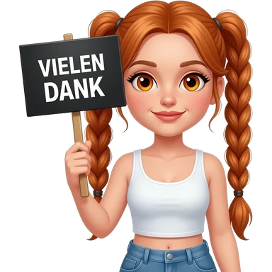 sexy girl with long ginger braids and ginger eyes wearing a white tanktop is holding a black sign with VIELEN DANK written on it emoji