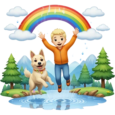 Beautiful White belgian Shepard jumping Cheerful with a little blonde Boy Who laughs over Rain puddles. There is a rainbow in the sky and a forest in the background emoji